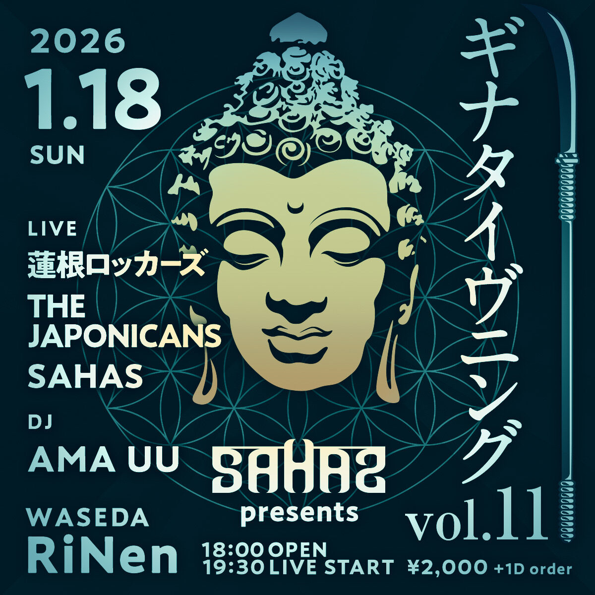 2026.1.18(Sun) at 早稲田RiNen 未分類 2025.12.242025.12.10 2026.1.18ギナタイヴニング vol.11 OPEN 18:00LIVESTART 19:30 LIVE 蓮根ロッカーズTHE JAPONICANSSAHAS DJAMA UU ¥2,000 +1D order sahasinfo.net